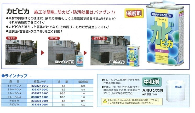 施工は汚れた部分に化学繊維100%の刷毛・ブラシで塗布もしくは噴霧器で噴霧してかるく拭き取り、水洗いするだけ。